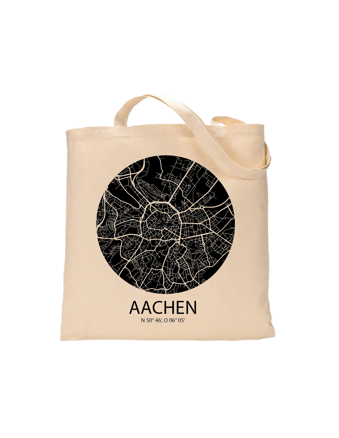 Streetmap "Aachen" - Jutebeutel Natur mit minimal Street Map aus der Vogelperspektive / Straßenkarten Design und Koordinaten der Stadt.