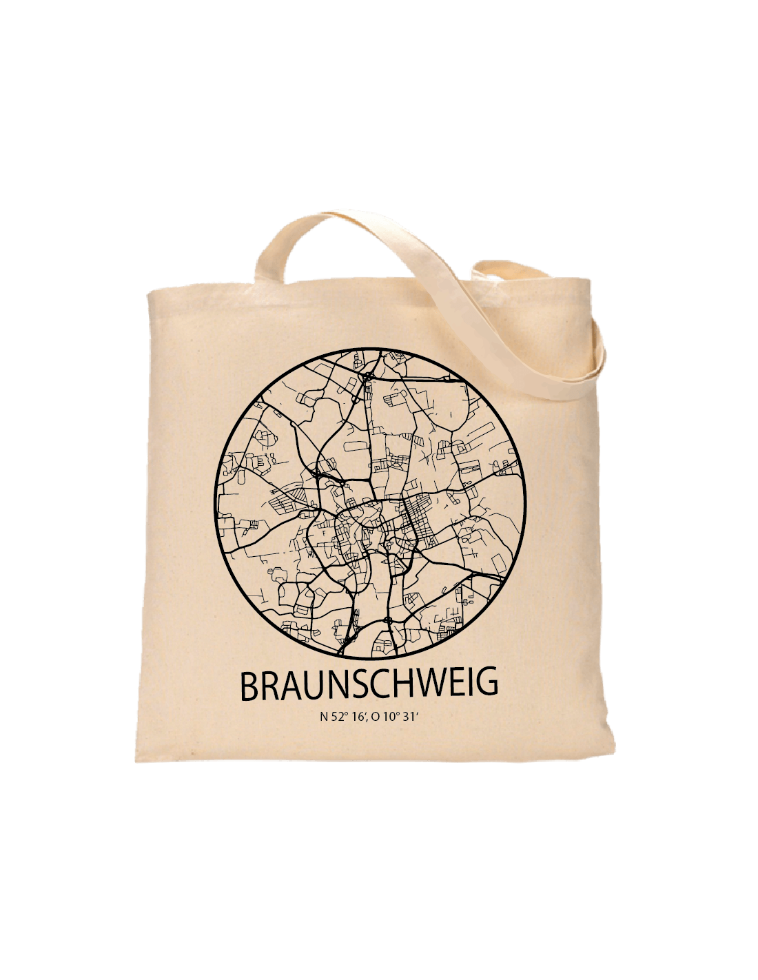 Streetmap Braunschweig - Jutebeutel Natur mit minimal Street Map aus der Vogelperspektive / Straßenkarten Design Sky Block Negativ und den Koordinaten der Stadt Braunschweig